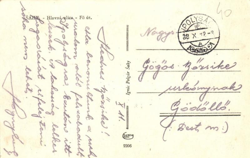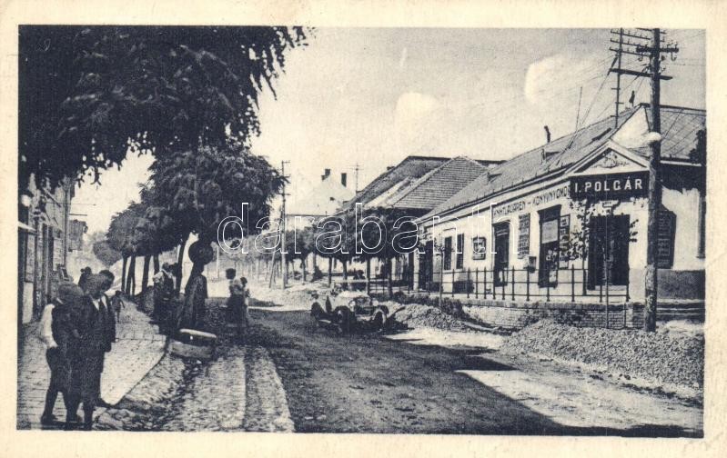 Leírás: 1938 Ipolyság, Sahy; Hlavná ulica / Fő utca, Polgár Ignác könyvnyomdája, üzlete, automobil. Polgár Ignác saját kiadása / main street, publishing house, publisher's shop, automobile (EK)