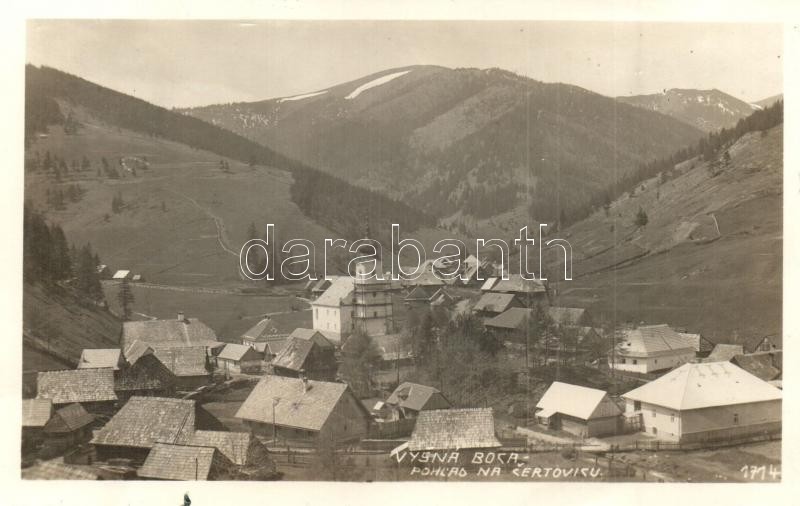 Királyboca, Bóczabánya, Vysná Boca; Pohlad na Certovicu / látkép az Ördöglakodalma-hágóval, templom / general view with Certovica mountain pass, church