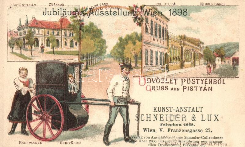 Pöstyén, Pistyan, Piestany; Curhaus, Neuer Park, Herren Gasse, Badewagen. Verlag A. Bernas. Jubiläums Ausstellung Wien 1898. / Gyógyterem, Új park, Úri utca, szálloda, fürdő kocsi, infanterista / spa hall, the new park, street view, hotel, infanterist. Art Nouveau, floral, litho (felületi sérülés / surface damage)