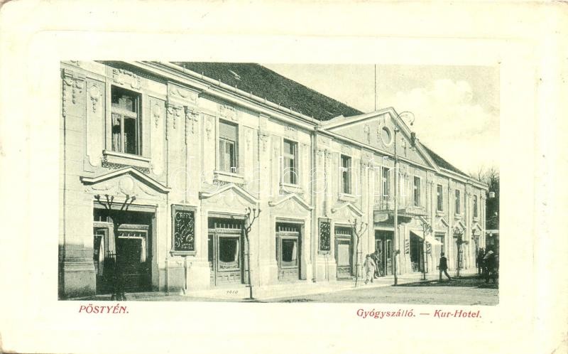 Leírás: Pöstyén, Pistyan, Piestany; Kur-Hotel / Gyógyszálloda, kávéház és étterem. W. L. Bp. 4404. Kiadja Schultz Paula / spa hotel, restaurant and café (EK)