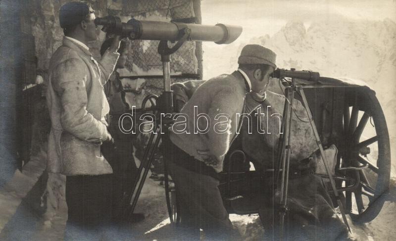 Cristallo-hegység, első világháborús osztrák-magyar katonák az olasz front hegyi állásánál, megfigyelő állásban távcsövekkel / 8 cm Schwalbenkofel Geschütz / WWI Austro-Hungarian K.u.K. soldiers, trenches at the Italian front, in the mountains, with telescope, photo