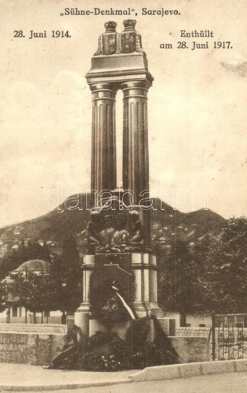 Szarajevó, Ferenc Ferdinánd és Chotek Zsófia ellen elkövetett merénylet emlékére készült szobor 1917-ben (Szégyen-emlékmű). Partizánok 1919-ben lerombolták / Sarajevo, Franz Ferdinand Sühne Denkmal / Memorial Monument for the assassination of Franz Ferdinand and his wife Sophie. Destroyed by partisans in 1919 + 1914 Világháború Emlékbélyeg