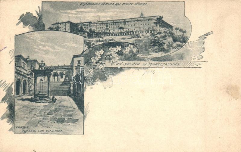 Leírás: Monte Cassino, Montecassino; Cortile di Mezzo con Scalinata, L'Abbadia veduta dal Monte Venere / courtyard, abbey. Art Nouveau, floral