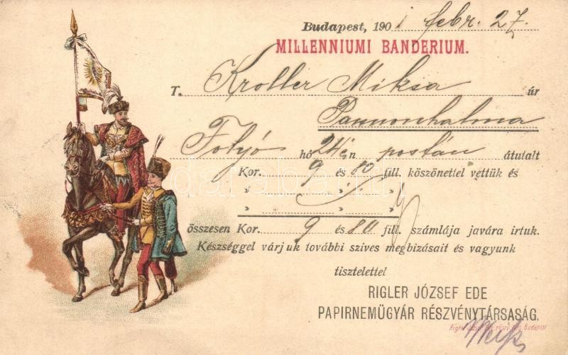 Leírás: 1901 Milleniumi Banderium. Rigler József Ede papírneműgyár részvénytársaság reklámlapja / Hungarian paper shop advertisement card. litho