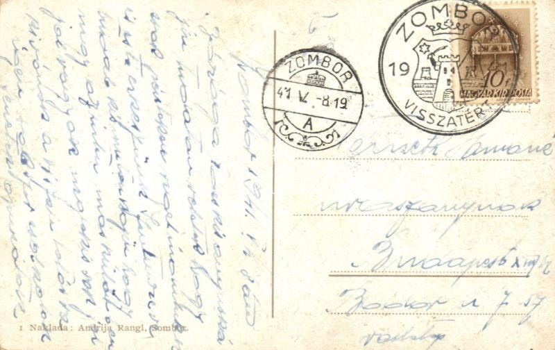 Leírás: Zombor, Sombor; Zeljeznicka Stanica / Vasútállomás, automobilok. Kiadja Andrija Rangl / railway station, automobiles + 1941 Zombor visszatért So. Stpl. (EK)