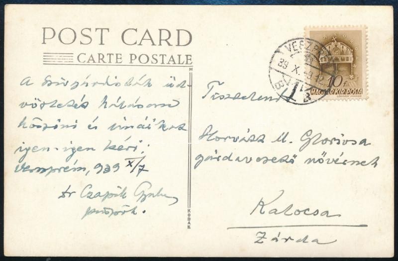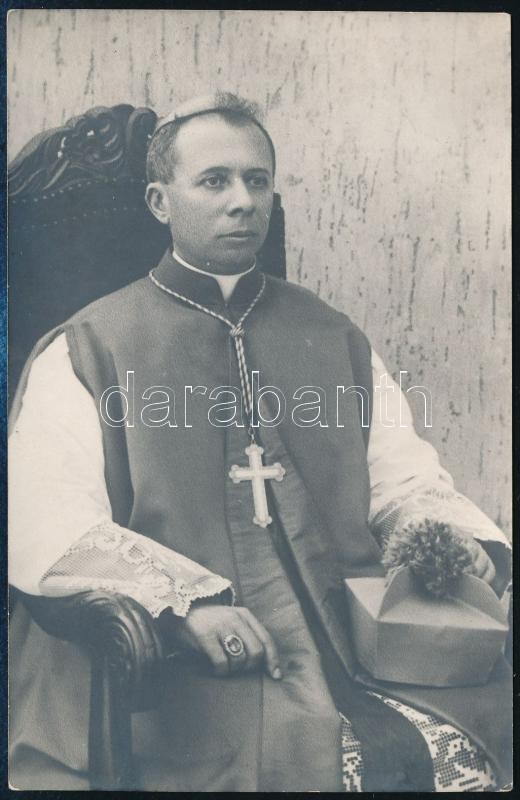 Leírás: 1939 Czapik Gyula (1887-1956) veszprémi püspök saját kezű sorai és aláírása egy őt ábrázoló képeslapon