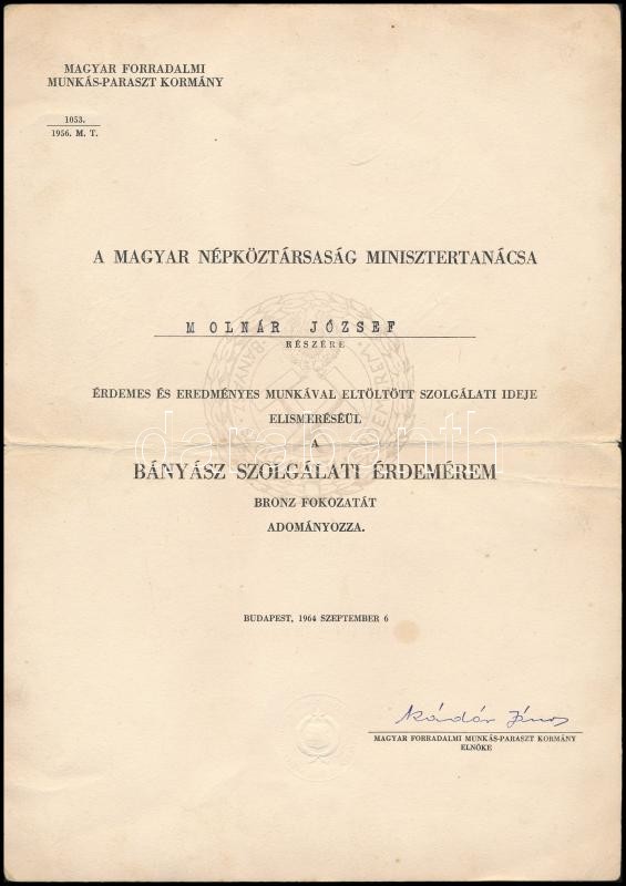 Leírás: 1964 Bányász Szolgálati Érdemérem kitüntetés adományozó okirat Kádár János autográf aláírásával