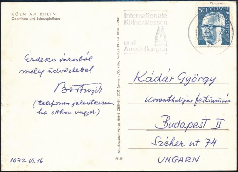 1972 Bortnyik Sándor (1893-1976) Kossuth-,Munkácsy-díjas festő, grafikus, Kíváló művész, főiskolai tanár, Magyar Képzőművészeti Egyetem igazgatója, szerkesztő, saját kezű sorai és aláírása egy képeslapon volt kollégája, tanártársa Kádár György (1912-2002) Kossuth-díjas festő, grafikus, főiskolai tanár részére.
