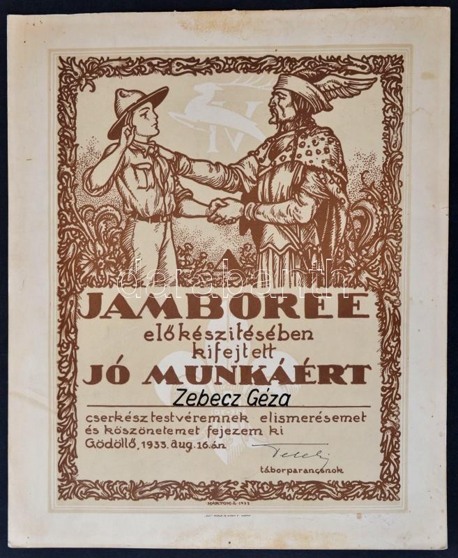 1933 Gödöllő, jamboree díszoklevél https://www.darabanth.com/hu/333-Gyorsarveres/333.0/Mutargy-papirregiseg-egyeb/Cserkesz~500029/1933-Godollo-jamboree-diszoklevel~II1866579
