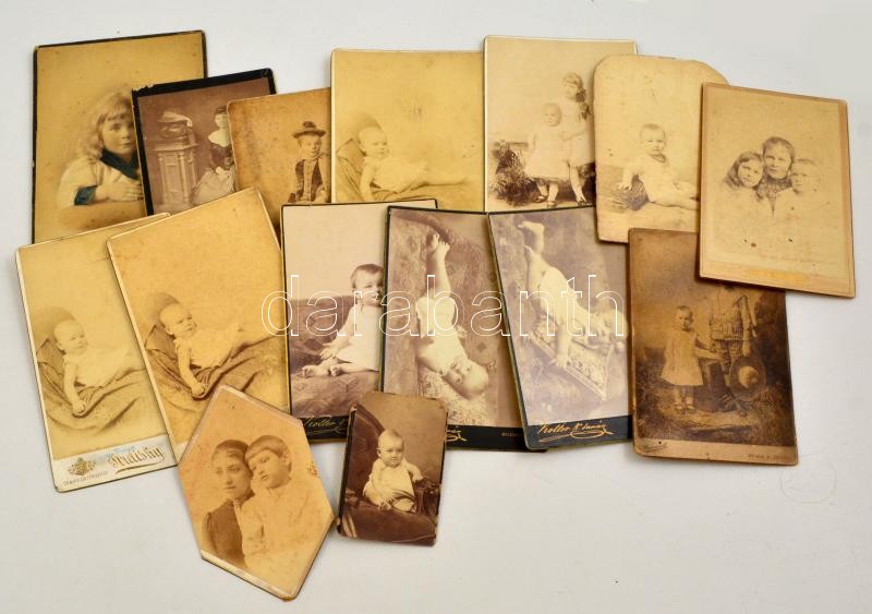 Vegyes keményhátú fotó tétel, 15 db, gyermekfotók, közte Bp.,Strelisky (6 db), Bp., Koller K. tanár (3 db), Bp. Mai és Társa, Pozsony, Fink Sándor (1 db), Bécs, Kizwanek (1 db) műtermekből, változó állapotban, közte körbevágottal, sérülttel, 21x13 cm és 9x6 cm közötti méretben