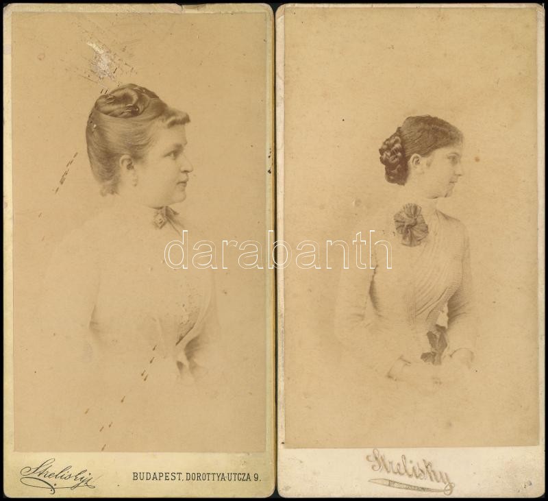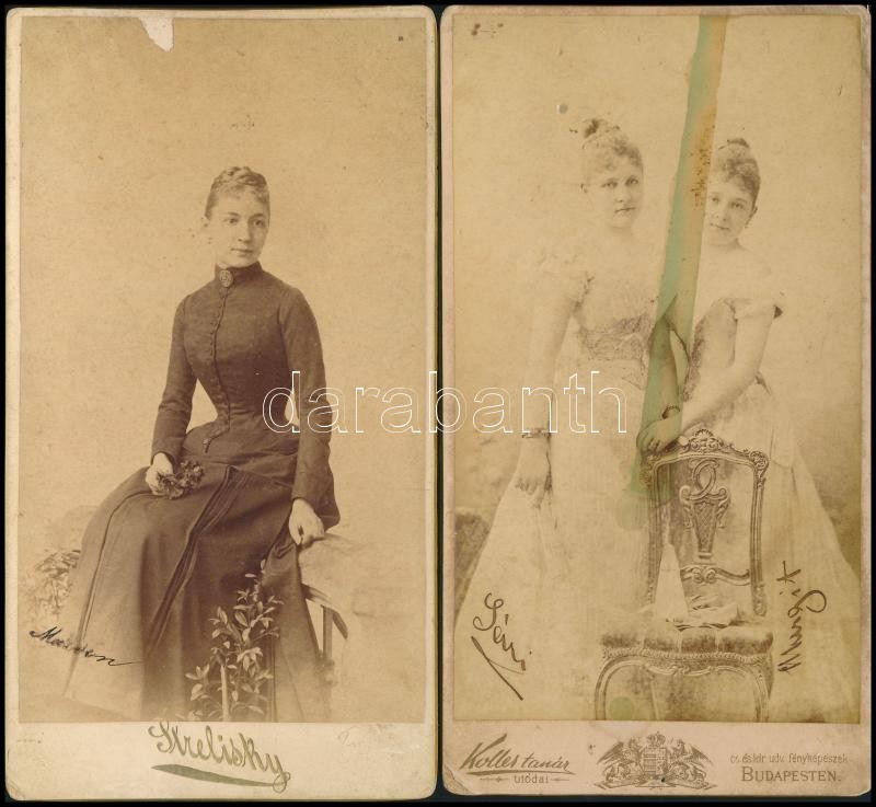 cca 1900 5 db nevesített keményhátú hölgyportré, Majtényi Sári, Zámory Margit, Sárközy Margit, Péchy Vilma, Mózser Anna, Teleszky Stefánia, Bp., Sterisky és Koller Károly tanár műtermekből, változó állapotban, közte foltos, kettő felületén sérülés, 20x11 cm