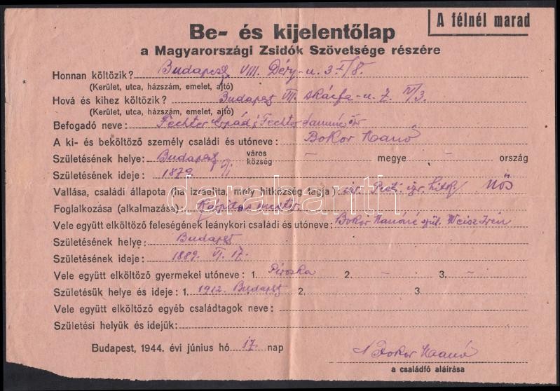 1944 Magyarországi Zsidók Szövetsége be- és kijelentőlap. https://www.darabanth.com/hu/333-Gyorsarveres/333.0/Mutargy-papirregiseg-egyeb/Judaika~500028/1944-Magyarorszagi-Zsidok-Szovetsege-be-es-kijelentolap~II1863683