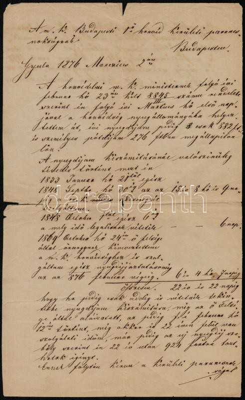 1876-1882 Gyula, Szende Béla (1823-1882) m. kir. honvédelmi miniszter (1872-1882) nyugállományú vagy szolgálaton kívüli viszonyban lévő honvédekről rendelkező rendeletének másolata, Gyula, 1880. dec. 5., m. kir. csongrád-békési 8. honvéd zászlóalj pecsétjével, Birsy József ny. alezredes részére, Birsy József aláírásával. További Birsy alezredes további két nyugdíjasítással kapcsolatos papírja. Az egyiken Birsy József aláírásával. Változó állapotban, szakadásokkal. nagyabonyi Birsy József (1816-1888) 1848-1849-ben honvéd tiszt, többek között Görgei Artúr tábornok karsegéde őrnagyi rangban, világosi fegyverletétel után halálra, majd 16 évi várfogságra ítélték, amelyből 7 évet Aradon letöltött, 1869-ben reaktiválták 1876-os nyugdíjazásáig.
