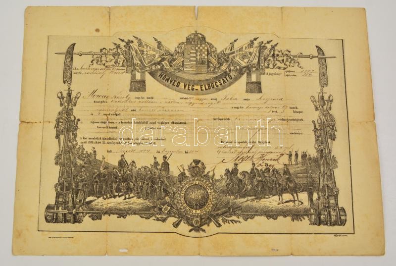 1884 Honvéd végelbocsájtó oklevél szakadásokkal / Obsit. 50x34 cm https://www.darabanth.com/hu/333-Gyorsarveres/333.0/Mutargy-papirregiseg-egyeb/Militaria~500031/1884-Honved-vegelbocsajto-oklevel-szakadasokkal-Obsit-50x34-cm~II1867002