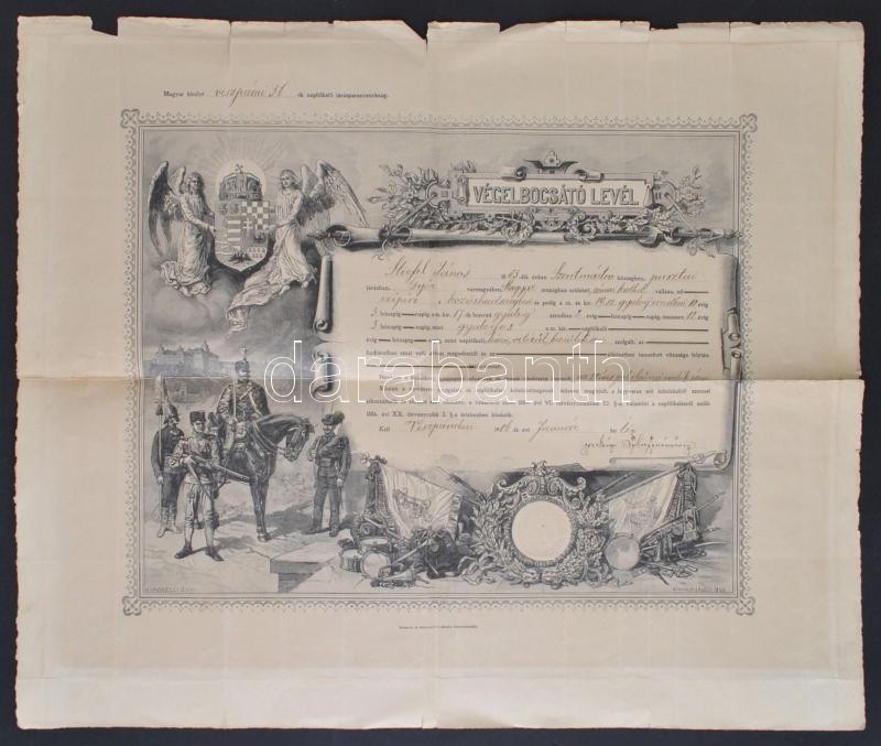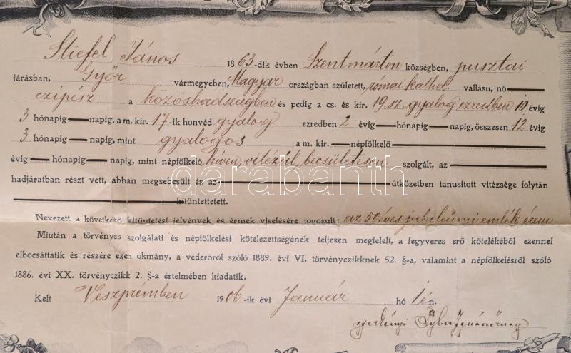 1906 Veszprém, díszes végelbocsátó levél (obsit) gyalogos részére, aki a cs. és. kir. 19. és 17. gyalogezredben szolgált, aláírással, pecséttel, szakadt, hajtásnyomokkal, a hátoldalon javítással.