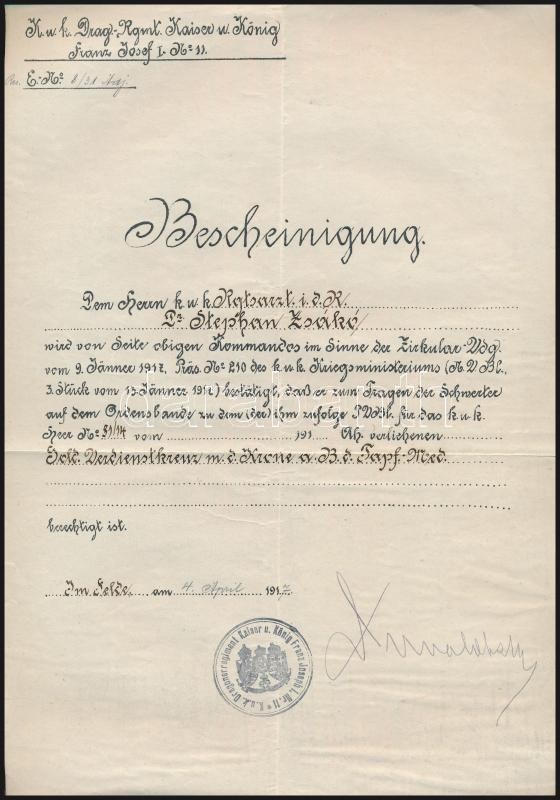 Leírás: 1917 A Cs. és kir. I. Ferenc József dragonyos hadosztály arany szolgálati kereszt a koronával kitüntetést adományozó okmánya, pecsételve, aláírással