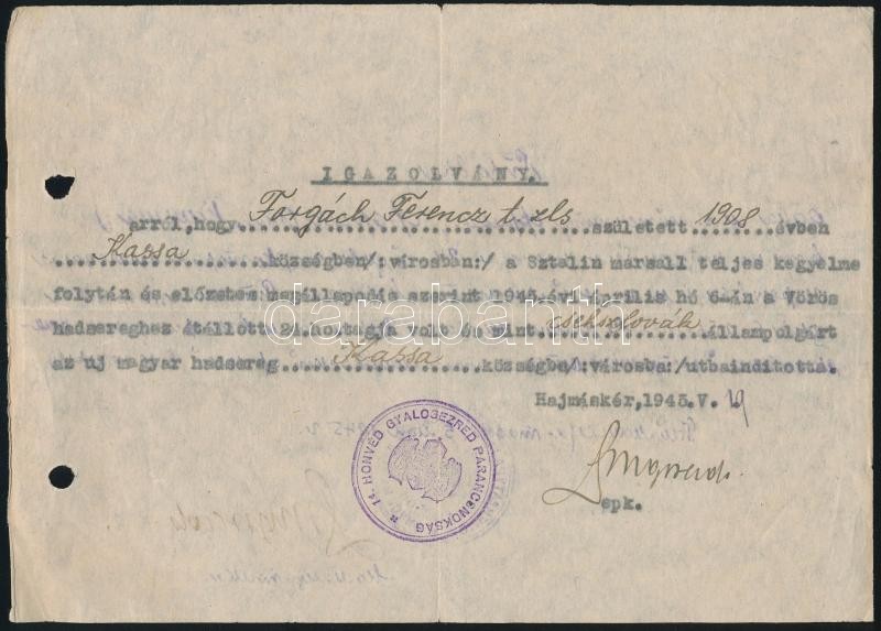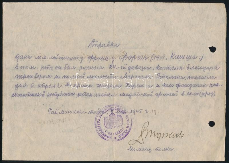 1945 Hajmáskér, Érdekes katonai igazolvány átállt magyar (felvidéki) katona számára, magyar és orosz nyelven, 14. Honvéd Gyalogezred Parancsnokság bélyegzővel