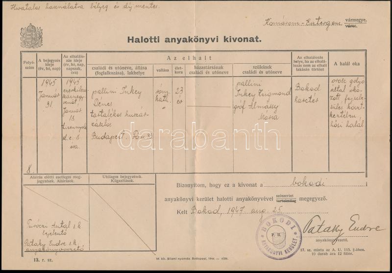 Leírás: 1947 pallini Inkey Dénes hősi halált halt tartalékos huszárzászlós halotti anyakönyvi kivonata