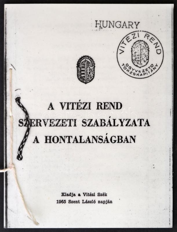 1965 A Vitézi Rend szervezeti szabályzata a hontalanságban. Kiadja a V... https://www.darabanth.com/hu/333-Gyorsarveres/333.0/Mutargy-papirregiseg-egyeb/Militaria~500031/1965-A-Vitezi-Rend-szervezeti-szabalyzata-a-hontalansagban-Kiadja-a-Vitezi-Szek-fenymasolat~II1865642