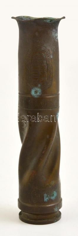 Leírás: Töltényhüvelyből készült váza "Staryj Oskol 1942" felirattal, kopásokkal, m: 22 cm