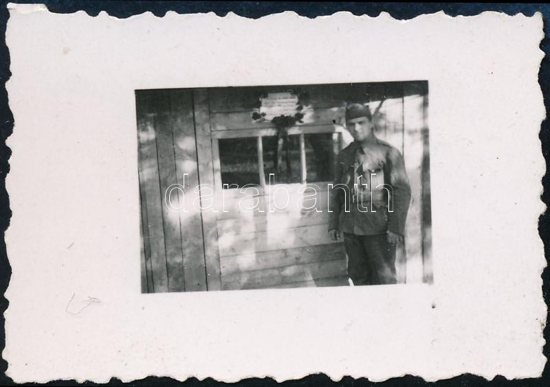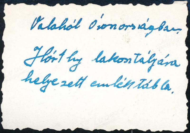 Leírás: cca 1942 "Valahol Oroszországban, Horthy lakosztályára helyezett emléktábla", kisméretű fotó, hátulján feliratozva, 4,5×6 cm