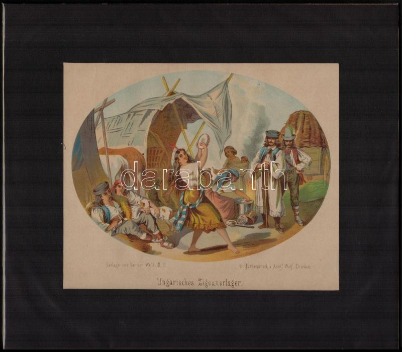 Leírás: cca 1880 Ungarische Zigeunerlager, Beilage zur Bunten Welt III., litho kép paszpartuban, 18×22 cm