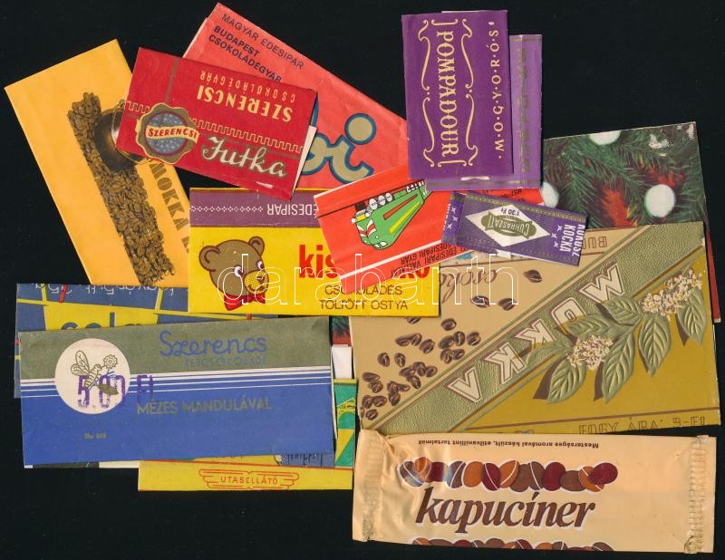 1960-1980 15 db régi csokoládépapír, közte, Tibi, Jutka( Szerencsi), Szerencs tejcsokoládé mézes mandulával, 2 db Pompadour, ...stb., változó állapotban, 1,5x4,5 cm és 12x7 cm közötti méretben