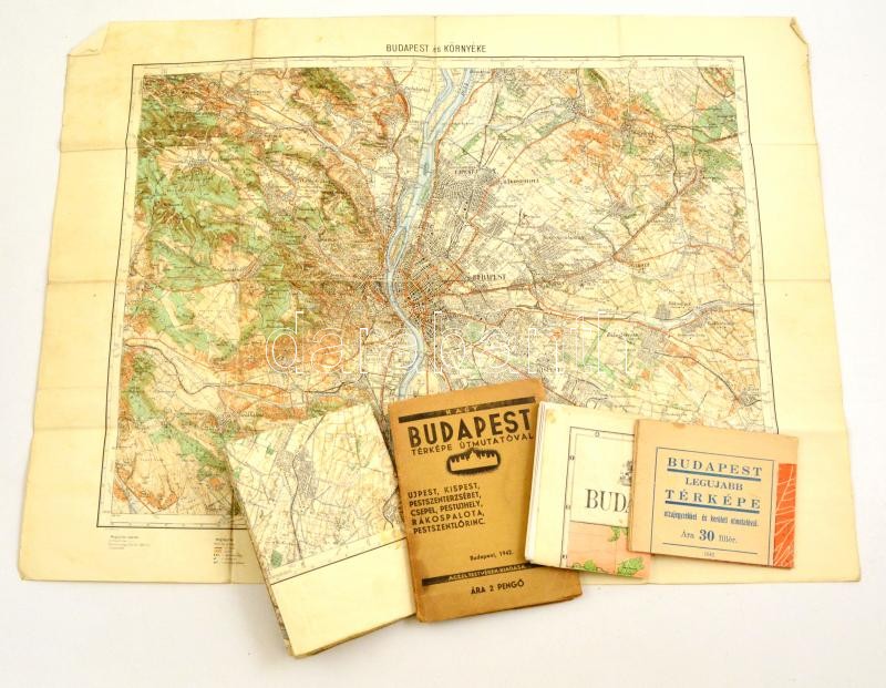 cca 1930-1940 Budapest témájú térképek, 5 db: 1933 Budapest és környéke, 1:75.000, M. Kir. Állami Térképészet, 39x51 cm 1934 Budapest és Nagytétény, 1:75.000, M. Kir. Állami Térképészet, a hajtások mentén kis szakadásokkal, foltos, 39x51 cm. 1942 Nagy Budapest térképe útmutatóval. Bp., Aczél Testvérek, 71+1 p+ 1 t., 65x92 cm Budapest legújabb térképe, a hátoldalán utcanévjegyzékkel, Szerk. és kiadja: Rácz Gyula, Bp., Féderer és Társa, a hajtások mentén szakadással, és ragasztás nyomokkal,46x35 cm Budapest térképe, Bp., Klösz György és Fia Térképészeti Műintézet, a hátoldalon javításnyomokkal, 46x62 cm.