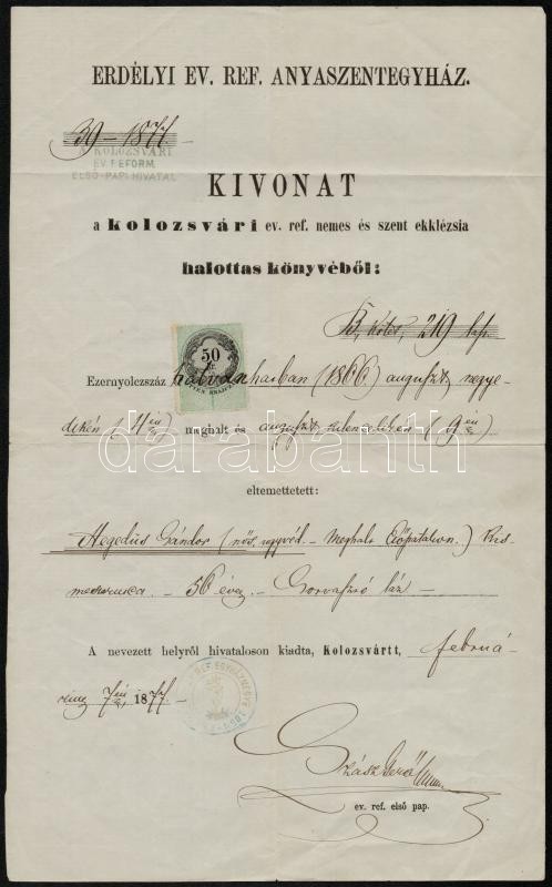 1877 magyarzsákodi Hegedüs Sándor ügyvéd, magyarzsákodi Hegedüs Sándor (1847-1906) újságíró, politikus, későbbi miniszter apjának, Jókay Jolán férje apjának halotti anyakönyvi kivonata, a kolozsvári református egyház által kiállítva, Szász Gerő (1831-1904) református esperes-lelkész aláírásával, 50 kr. okmánybélyeggel