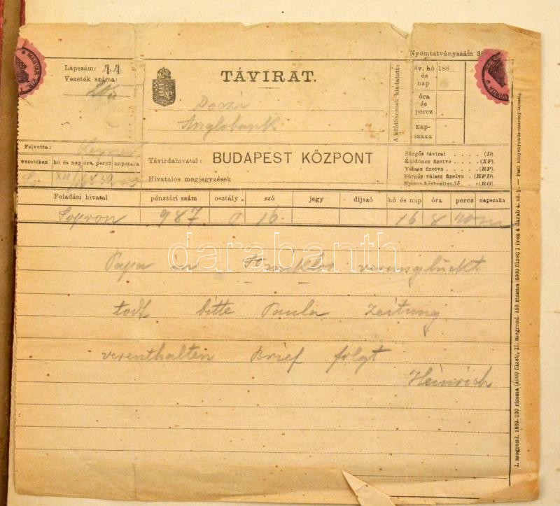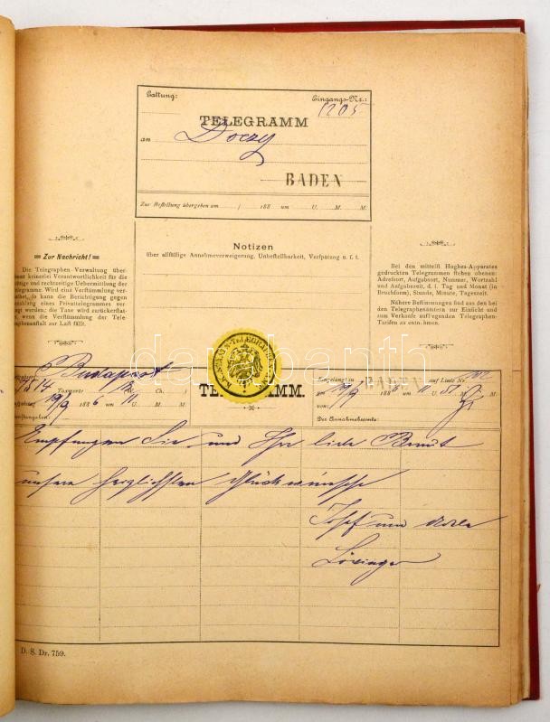 1886 báró Dóczy Lajos (1845-1918) újságíró, költő, Andrássy Gyula miniszterelnök fogalmazója, esküvőjére kapott gratuláló levelek és táviratok gyűjteménye. 92 oldalon. aranyozott egészvászon kötésű könyvben. 25x32 cm + hozzá: György József: Dóczi Lajos. Bp., 1932. 62p. (fűzött papírkötés, elvált borító, felvágatlan)