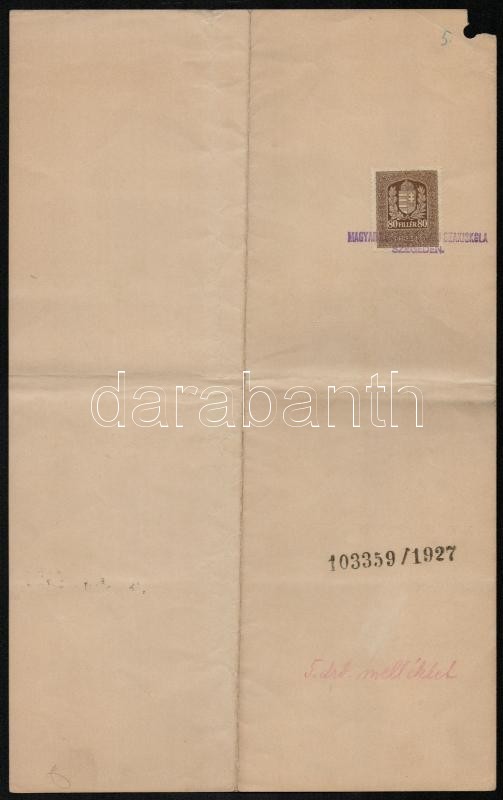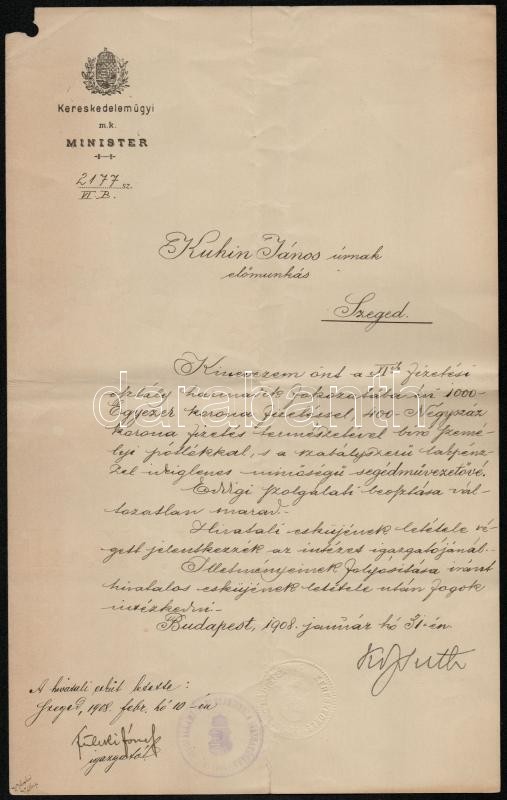 1908 Előmunkás hivatali előléptetése segédművezetővé, Kossuth Ferenc (1841-1914) kereskedelemügyi miniszter aláírásával, a minisztérium fejléces papírján, szárazpecséttel, 80 f. okmánybélyeggel, kissé szakadt.