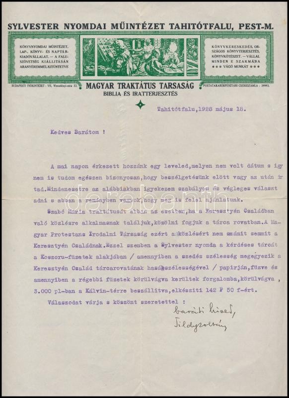 1928 Tildy Zoltán (1889-1961) református lelkész, későbbi miniszterelnök, köztársasági elnök gépelt, aláírt levele azonosítatlan címzetthez értekezés kiadása tárgyában, a Sylvester Irodalmi és Nyomdai Intézet / Magyar Traktátus Társaság fejléces papírján