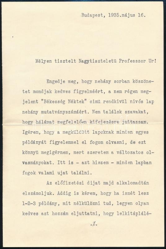 1935 Dr. Hercegh Józsefné a cleavlandi első magyar református papnéjának gépelt levele, aláírásával, Dr. Domján János (1905-1983) református lelkésznek, tanár, újságírónak,
