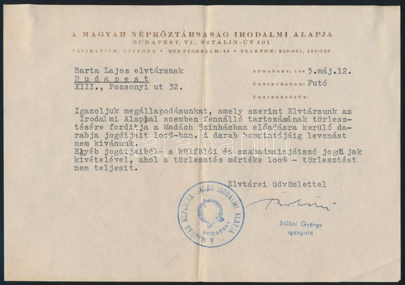 1955 Bölöni György (1882-1959) Ãró, Magyar Népköztársaság Irodalmi Alapjának igazgatójának (1950-1959) gépelt levele Barta Lajos (1878-1964) Ãró részére, tartozás törlesztése ügyében, Bölöni György aláÃrásával, fejléces papÃron.