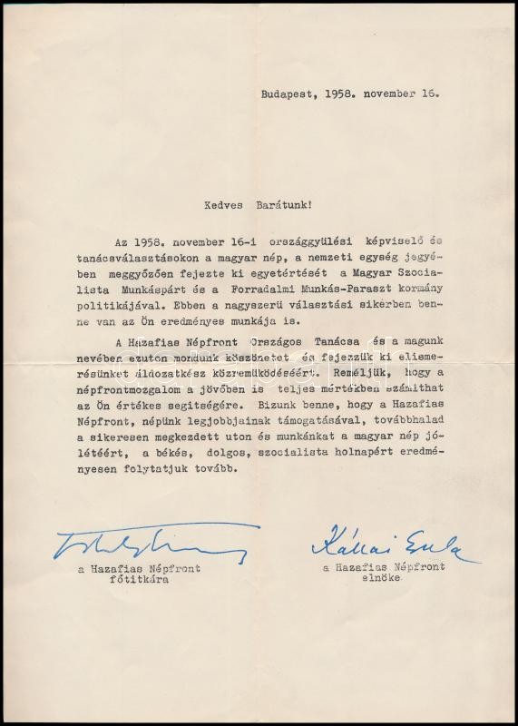 1958 Hazafias Népfront gépelt köszönő levele a választási sikerben való közreműködésben, Kállai Gyula (1910-1996) elnök, politikus, miniszter, későbbi miniszterelnök (1965-1967), Ortutay Gyula (1910-1978) főtitkár, politikus, néprajzkutató aláírásaival.