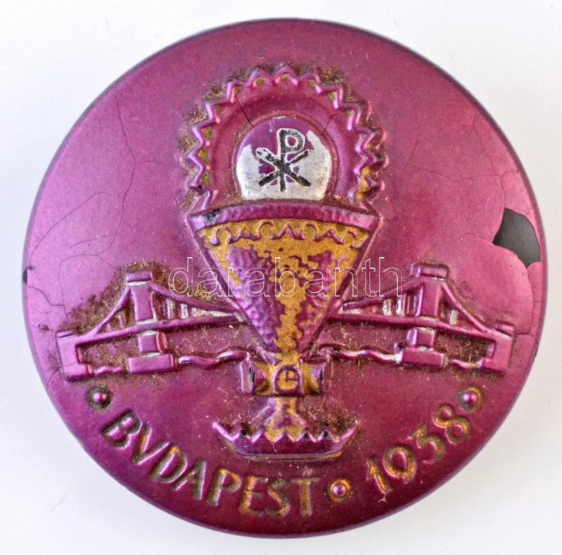 Madarassy Walter (1909-1994) 1938. "XXXIV. Nemzetközi Eucharisztikus Kongresszus Budapest" zománcfestékkel(?) színezett bakelit jelvény "NONVM CENTENARIVM S STEPHANI REGIS HVNGARIAE" (55mm) T:2 egy helyen lepattogzott festés