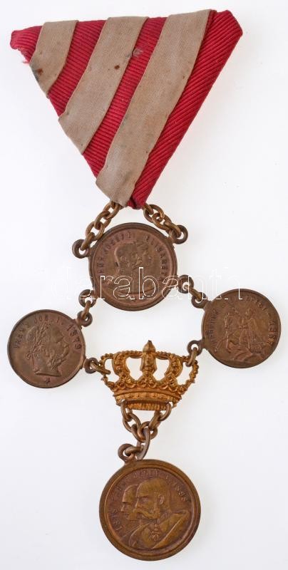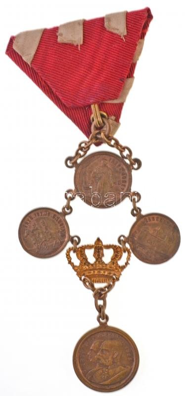 Osztrák-Magyar Monarchia 1898. Ferenc József uralkodásának 50 éves jubileumára készült, négy érméből álló jelvény, kitüntetés stílusú szalagon "FRANZ JOSEF I - ELIZABETH / FRANZ JOSEF I 1848", "FRANZ JOS I 1879 6 HABSBURG / HABSBURG", "KRÖNUNG I. BUDAPEST 1867 / ERZH. FRZ. JO. B. LUCIA.", "1848 FRANZ JOSEF I. 1898 / ZUR ERINNERUNG A. D. 50. JAHRIG REGIERUNGS JUBILAUM 1898" T:1-