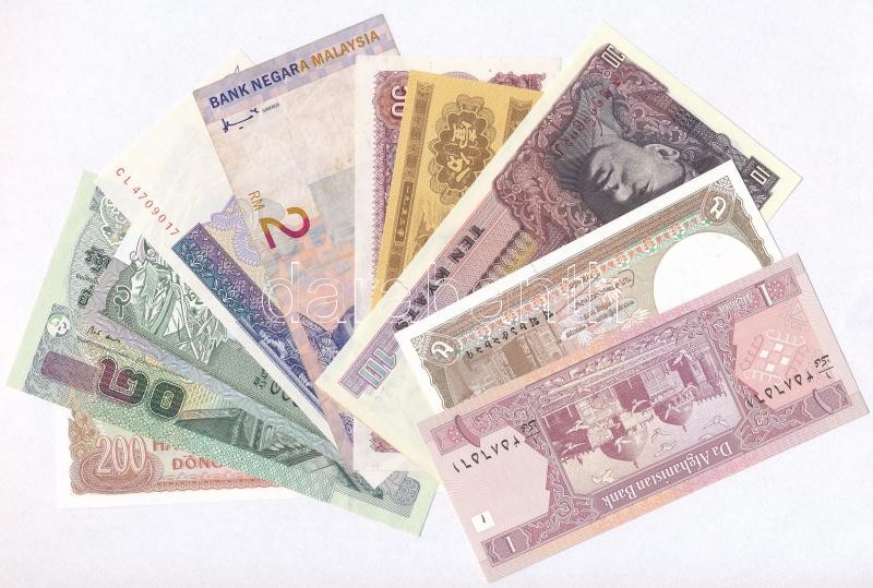 11db-os vegyes külföldi bankjegy tétel, ázsiai országokból, közte Afganisztán, Burma, India, Kína, Thaiföld, Vietnam T:I-III 11pcs of various banknotes from Asian countries, including Afghanistan, Burma, India, China, Thailand, Viet Nam C:UNC-F