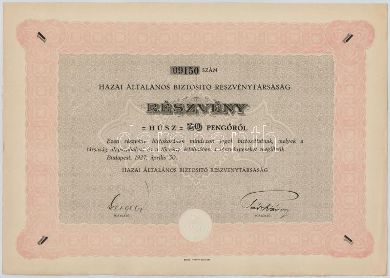 Budapest 1929. "Az Első Magyar Általános Biztosító Társaság"... https://www.darabanth.com/hu/333-Gyorsarveres/333.0/Numizmatika/Reszvenyek-es-sorsjegyek~2000004/Budapest-1929-Az-Elso-Magyar-Altalanos-Biztosito-Tarsasag-reszvenye-20P-rol-szarazpec~II1862498