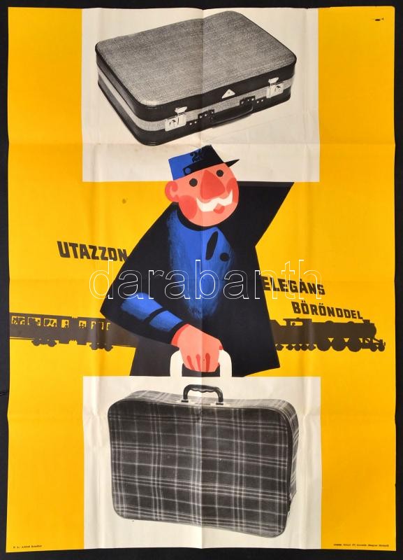 Leírás: Utazzon elegáns bőrönddel, plakát, Bp., Magyar Hirdető, Zrínyi Nyomda, hajtásnyommal, 82×57 cm