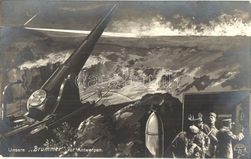 Unsere "Brummer" vor Antwerpen / WWI German military art postcard, can... https://www.darabanth.com/hu/334-Gyorsarveres/334.0/Kepeslapok/Katonai~2000085/Unsere-Brummer-vor-Antwerpen-WWI-German-military-art-postcard-cannon~II1876497