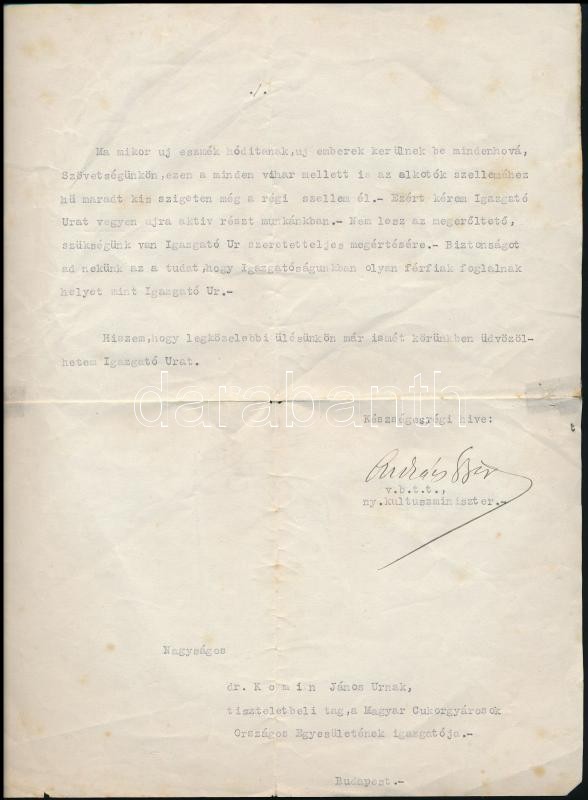 Lukács György (1865-1950) ny. kultuszminiszter aláírása egy dr. Komin Jánosnak (1871-1940) a Magyar Cukorgyárosok Országos Egyesületének igazgatójának szóló gépelt levéltöredéken