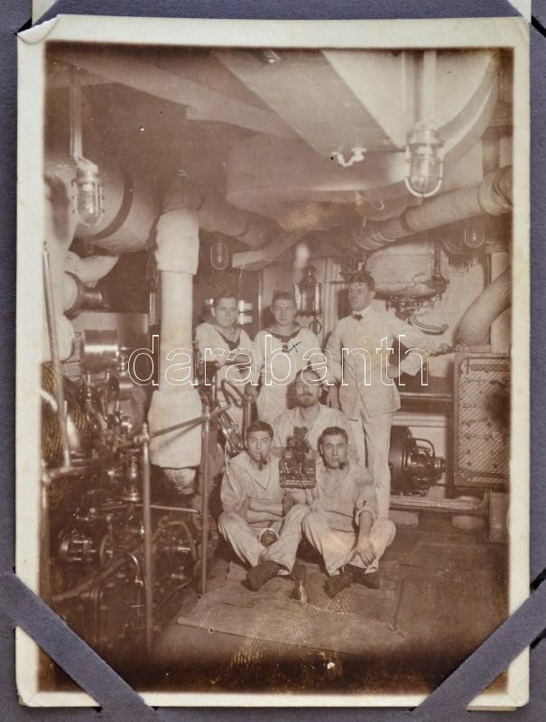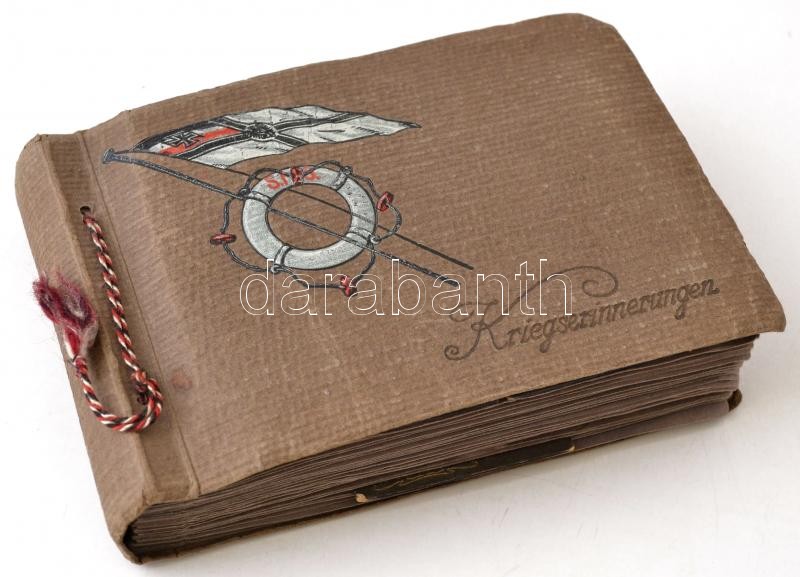 cca 1915 Fotóalbum benne 69 db fotóval, nagyrészt az SMS Nassau német csatahajó legénységét ábrázoló képekkel, Kriegserinnerungen feliratú albumban, képméret: 12x5 és 14x9 cm között / Photo album with 69 photos, with Imperial German Navy mariners photo