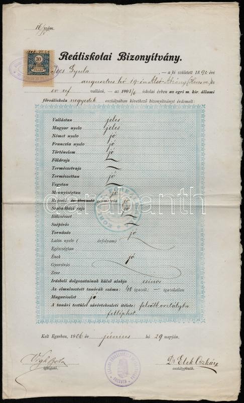 Leírás: 1906 Eger, Reáliskolai bizonyítvány, Dr. Elek Oszkár (1880-1945) irodalomtörténész aláírásával, 30 f. okmánybélyeggel