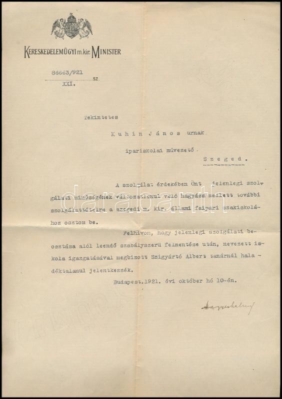 Leírás: 1921 Ipariskolai művezetői áthelyezési értesítése, Hegyeshalmy Lajos (1862-1925) kereskedelemügyi miniszter saját kezű aláírásával, fejléces papíron.