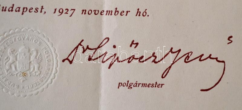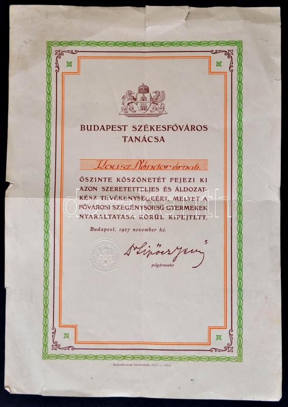 1927 Köszönetnyilvánító oklevél Budapest Székesfőváros Tanácsa által, Kousz Nándor (Szávai Nándor (1906-1979) író, műfordító részére, a szegénysorsú gyerekek nyaraltatásában kifejtett tevékenységéért, szárazpecséttel, Dr. Sipőcz Jenő (1878-1937) főpolgármester saját kezű aláírásával. szakadozott.