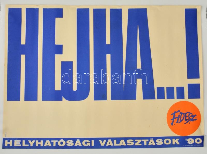 1990 Kemény György (1936-): "Hejha...!" a Fidesz választási plakátja a... https://www.darabanth.com/hu/334-Gyorsarveres/334.0/Mutargy-papirregiseg-egyeb/Plakat~34/1990-Kemeny-Gyorgy-1936-Hejha-a-Fidesz-valasztasi-plakatja-a-helyhatosagi-valasztC3~II1857481