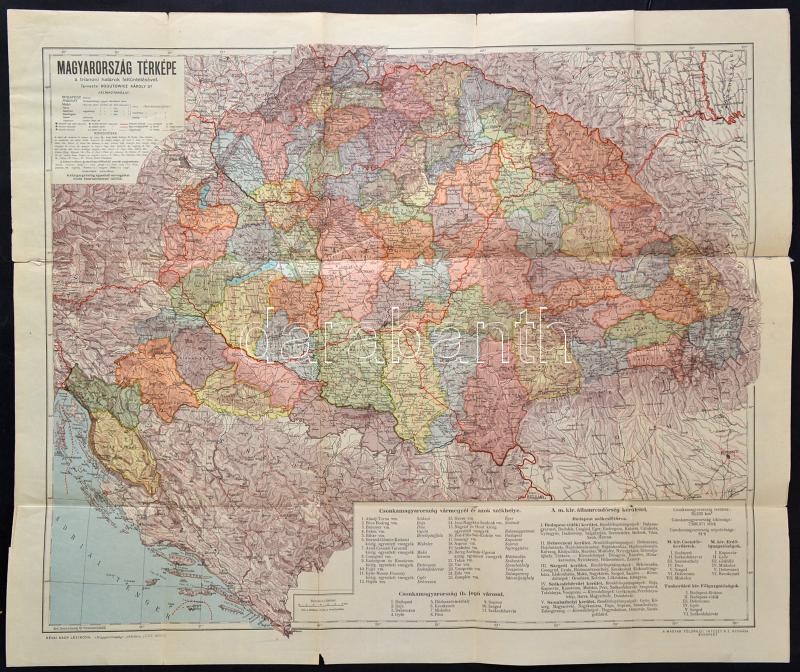 Leírás: Magyarország térképe a trianoni határok feltüntetésével, terv.: Kogutowicz Károly, kiadja a Magyar Földrajzi Intézet Rt., hajtásnál javított, 59x71 cm