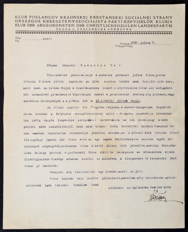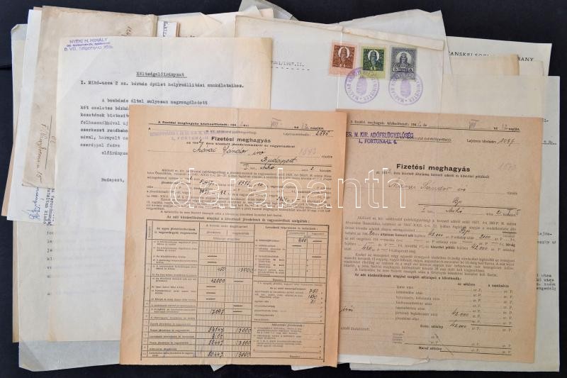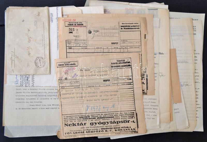 1924-1945 Márai Sándor (1900-1989) író és családjának ( Dr. Grosschmid Géza (1872-1934) felvidéki kisebbségi politikus, szenátor, miskolci királyi közjegyző, Radványi Géza (1907-1986) Kossuth-díjas magyar filmrendező, Grosschmid Gábor, Groschmid Katalin (Jáky/Jetts Gyuláné) és férje Dr. Jáky/Jetts Gyula) hagyatéka, többségében hivatalos iratok, kérvények, (13 db) valamint 2 gépelt levél, valamint Jáky Gyula és Grosschmid Kató esküvői meghívója, és 3 db esküvői üdvözlő távirat, 1 db Grosschmid Géza nagyapusnak szóló képeslap, Jáky/Jetts Gyula papírjai és Protestáns Juniális, Sziget-Club (1925) meghívója (3 db), összesen 23 db. Érdekes, átnézendő anyag. Változó állapotban.