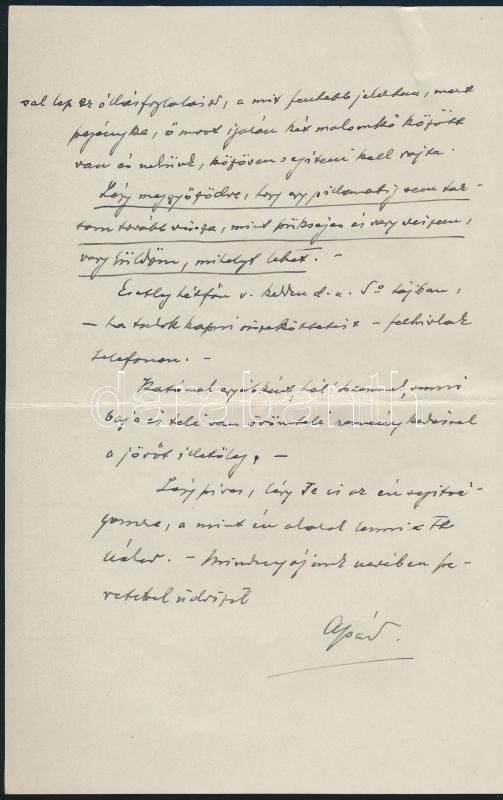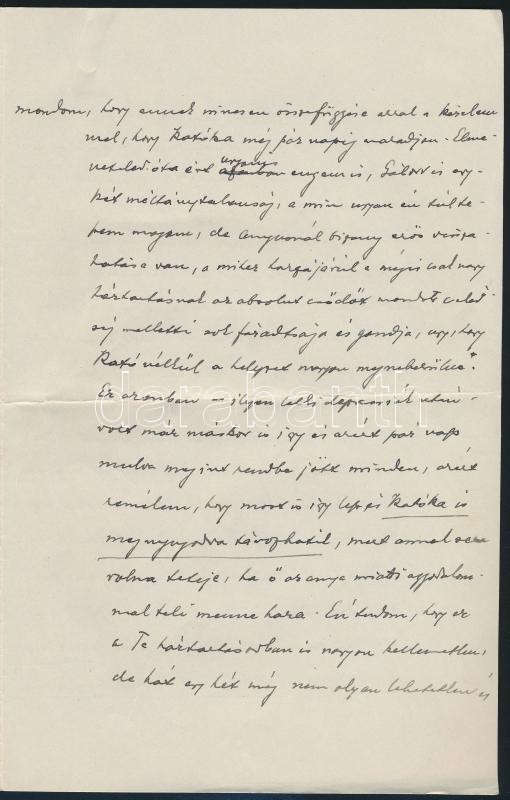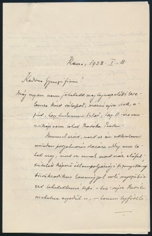 1928 dr. nemes Grosschmid Géza (1872-1934) királyi közjegyző, a kassai jogászkamara elnöke, csehszlovák szenátor és Márai Sándor apjának levele Dr. Jáky Gyula, lánya Grosschmid Kató férjének részére, "Kedves Gyuri fiam!" megszólítással, benne több helyen Katót említő sorokkal, hat kézzel írt oldal.